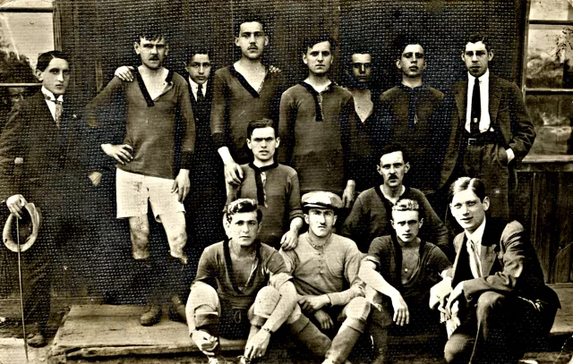 Ezen a képen apám balról az első. Nagy futballrajongó volt. Itt, Budapesten készült a kép az 1910-es években. Nem tudom, hogy kerülhetett oda a focisták közé.