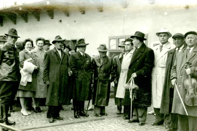 A kép valószínűleg a dunaszerdahelyi városháza udvarán készült az 1950-es években egy majálison. Az egyik férfi kezében kis májusfa van, ő Steckler Jenő, egy dunaszerdahelyi zsidó. A bal oldali hölgy Brossmann Matilda, a dunaszerdahelyi Mototechna főnöknője, nem zsidó. A jobb oldali a feleségem, aki a helyettese volt. Balról az első Alfoldi Józsi bácsi, nagy kommunista, ő volt az első "komisszár" Dunaszerdahelyen. Jóindulatú ember volt, de sem olvasni, sem írni nem tudott. Apámmal együtt volt bezárva Kistarcsán.