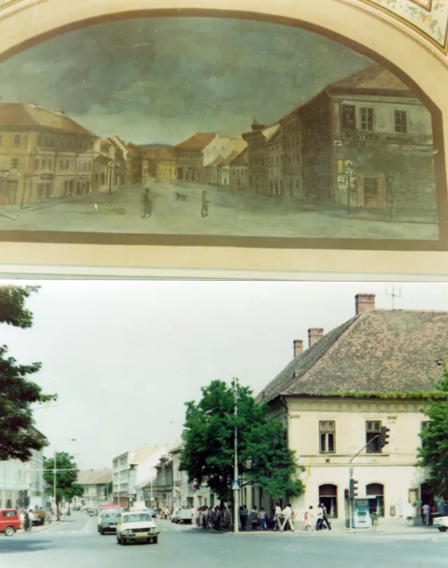 A Fő tér közepén, a jobb oldali sarokházban volt nagyapámnak, Mestitz Mihálynak az első bútorüzlete az 1850-es években. A házasságkötő teremnél -- ahogy bemegy az ember a kapun, mindjárt a kapu alatt, balra a második kép -- van ez a falra festett festmény [ami a felső képen látható]. Nem tudom, ki festette a képet. A nagyapa idejében így nézett ki a Kossuth Lajos utca [a szemben lévő utca] és a ház, még az is látszik a képen, hogy a házra fel volt valamikor írva: Mestitz Mihály és fiai.