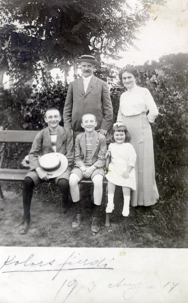 Ez Mestitz Ferenc, a nagybátyám és a családja Kolozsfürdőn. 1913 augusztusában készült a fénykép, nyaralás közben. Ők Kolozsváron éltek. "Mindannyiukat sok szeretettel csókolja Jancsi, Gyurka, Bözsi" -- ez van a kép hátára írva. Borszékre címezték a levelezőlapot, tehát anyukáék is éppen nyaralhattak Borszéken. Gyakran nyaraltak Borszéken, mert apám imádott ott lenni. Három-négy hétig biztosan ott voltak, s akkor oda küldhették a leveleket.