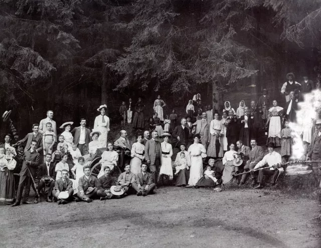 Ezen a képen csak apukát ismerem. Borszéken készült a kép. Itt nem volt még nős ember. Még mielőtt megházasodott volna, már járt Borszékre [Borszék Románia egyik legnevesebb borvíz-forrás vidéke. A borvíz egyfajta ásványvíz. -- A szerk.]. A fényképen az első sorban van, éppen tölt egy üvegből, azt hiszem, bort.