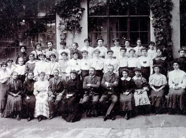Itt anyuka van -- a második sorban jobbról a harmadik, az első fehér blúzos --, egy felsőbb leányiskolában, 1908-ban, talán Marosvásárhelyen, de ez nem biztos [Scheiner Júlia édesanyja az érettségi után került Marosvásárhelyre, miután férjhez ment. -- A szerk.]. Ezek lehettek az osztálytársai. Anyuka érettségizett, s azután férjhez ment.