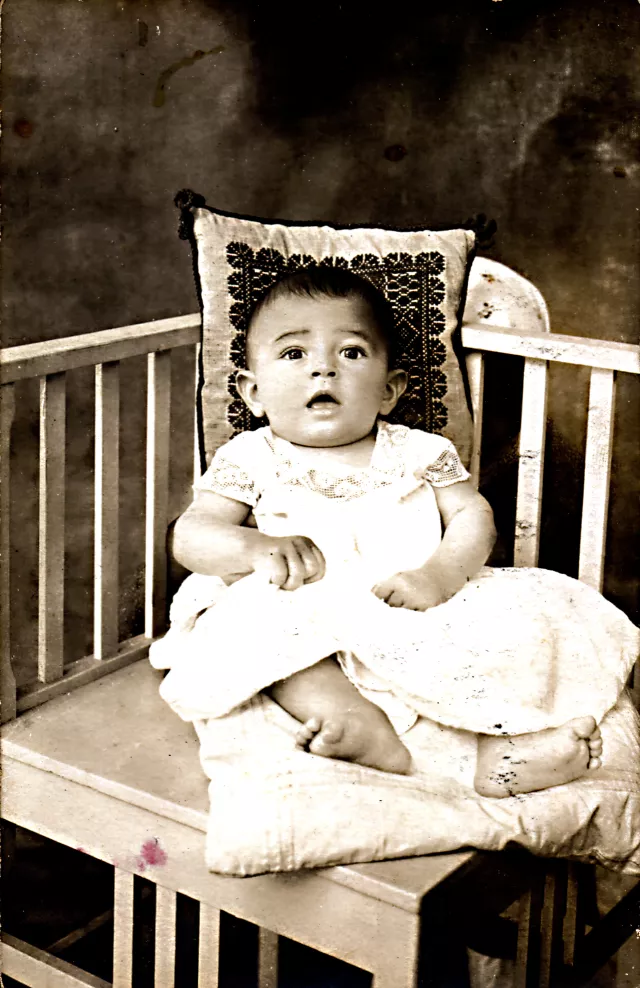 Ez én vagyok Kiskunhalason. Itt lehettem úgy egy éves, tehát akkor 1921-ben készülhetett a kép. Fényképész csinálta, valószínűleg bevittek a fényképészhez Kiskunhalason.