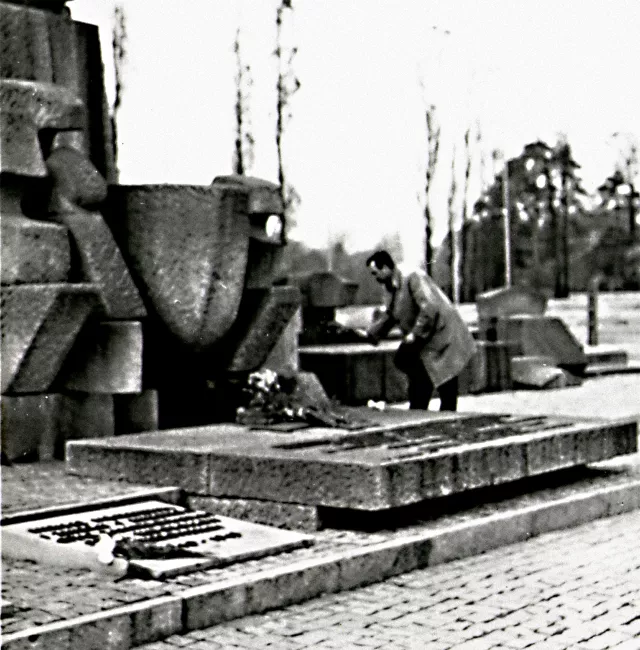 A képen én vagyok, és ez Auschwitz, illetve a Birkenau-emlékmű. Az 1970-es évek elején voltam ott. Ez egy hivatalos társasút volt, négy vállalati igazgatónak szerveztek különböző szakmai tárgyalásokat. Az ajkai igazgató biztos, hogy volt, mert annak volt egy kisebb afférja. Lengyelországban voltunk, és alumíniumkohókat és feldolgozó üzemeket látogattunk meg, és Krakkóban is voltunk. A lengyel kísérőinkkel vagy tárgyaló partnereinkkel ebédeltünk, és a kollégám Krakkót Krakau-nak mondta, és kikérték maguknak. Ő egy kitűnő, nagytudású ember volt, és annak idején az iskolában még úgy tanulta meg, hogy Krakau, és az ő emlékezetében így maradt meg.