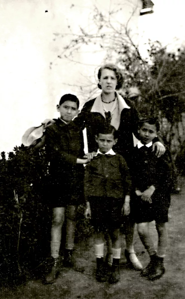 Ez a kép Kiskunhalason készült. Ez én vagyok (balra), itt lehettem olyan 8-9 éves, tehát akkor a kép 1928-ban vagy 1929-ben készült. A jobb szélén a középső öcsém, Laci van, és középen van a legkisebb öcsém, Anti. A nő egy nevelőnő volt. Amikor 1928-ban férjhez ment a nővérem, Manci, a sógoromnak fixa ideája volt, hogy német nyelvű nevelőnőt vegyenek. Fräuleinnak hívtuk. A nevére nem emlékszem. Ausztriából jött, azt tudom, Budapesten közvetítették ki. Budapesten voltak ilyen állásközvetítők, onnan közvetítették ki. Egy nagyon egyszerű, tiszta, rendes, szolidan öltözködő, nem fiatal, olyan 35 év körüli lehetett. Nagyon jó viszonyban voltunk, nagyon szerettük, ő is bennünket, de inkább csak nevelőnő volt. Valamennyire tudott magyarul, amikor hozzánk került, de jól nálunk tanult meg. Mi nagyszerűen megtanítottuk őt magyarul. Ő igyekezett, hogy tanítson minket németül, de nem sok sikerrel. A mi nagy házunkban volt egy külön szobája, ott lakott. Több mint egy évig volt nálunk. Azért ment el aztán, mert nem volt két krajcár, és miután látták az édesanyámék, hogy nem sok haszna van, a legnagyobb barátsággal elváltunk tőle. Édesanyám özvegyen nevelt bennünket. Már ez is egy erőn felüli vállalkozás volt, hogy nevelőnőt vállalt.