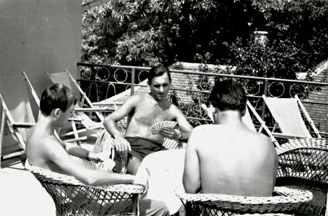 Ez Keszthelyen van, a Bakonyi Bauxitbánya üdülőjében. Balra ül a fiam, a Péter, a háttal ülő nem tudom, kicsoda, szemben én vagyok, ultizunk. Péter itt már legalább 17 éves volt, tehát a kép 1963-ban vagy 1964-ben készülhetett.