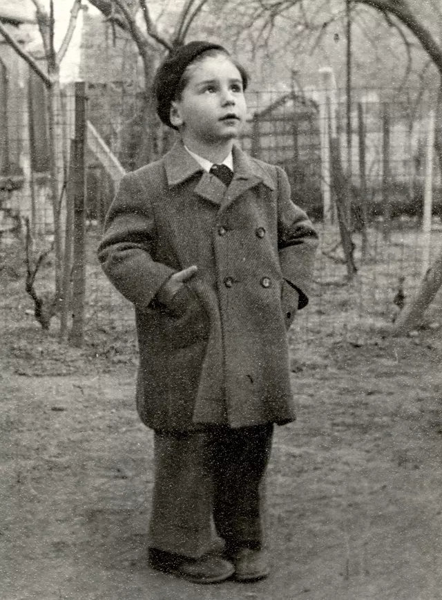Ez a nagyobbik fiam, az udvarunkon. A ruháit a férjem csinálhatta, mert én ilyen nagyobb dolgokat nem csináltam, az férfi szakma volt. Nadrágokat rengeteget varrtam neki, de ilyet nem. És hát akkor a svájci sapka volt a divat. Még meg is van, olyan kis kötött sapka, én kötöttem neki.