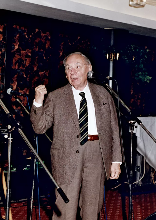 A kép 1999-ben készült. A Hungária nagyszállónak valamilyen jubileuma volt, és engem mint a ház legrégibb törzsvendégét felkértek, hogy egypár szót beszéljek. Mi a Rákóczi úton laktunk, közel a szállodához, amit akkor még Imperialnak hívtak, és sokkal kisebb volt. A mai étterem helyén volt a Debrecen vendéglő, ahova a szüleimmel gyakran lejártunk ebédelni vasárnaponként. Feltehetően már 1923-ban ettem ott egypárszor. Aztán amióta átépítették a szállodát, és Szabadság szálló, majd Hungária nagyszálló lett, Klárival szinte rendszeresen a szálloda sörözőjében ebédeltünk. Abban az időben elég sok író volt ott törzsvendég, egyebek közt Mándy Iván majdnem minden nap ott ebédelt. Színészek jártak oda, például Básti Lajos.