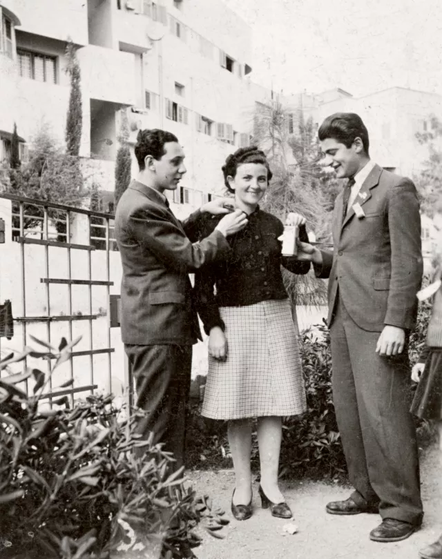 Haifa, 1941. Sarlós Laci barátommal a háziasszonyunk gallérjára tűzzük a Keren Kajemet jelvényét. És ott a kezünkben a persely, amibe gyűjtöttünk. A Keren Kajemet azt jelenti, hogy létalap. Izrael részére gyűjtöttek az egész világon a két világháború közötti időben. A bal oldali vagyok én.