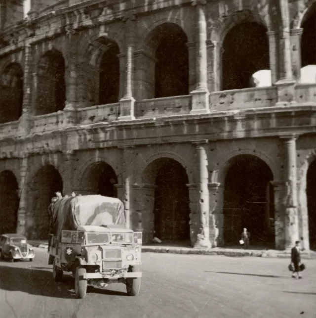 1944 nyarán átvitték a térképész századot Olaszországba. Tarantóban szálltunk partra, és onnan haladtunk fel észak felé. Leghosszabb ideig a Siena melletti Santa Colombe nevű faluban állomásoztunk. A kép Rómában készült, útban Siena felé. Nyolc év után ismét láthattam a Colosseumot, de most angol egyenruhában voltam, angol katonai teherautón, amire egy Dávid-csillag volt festve.