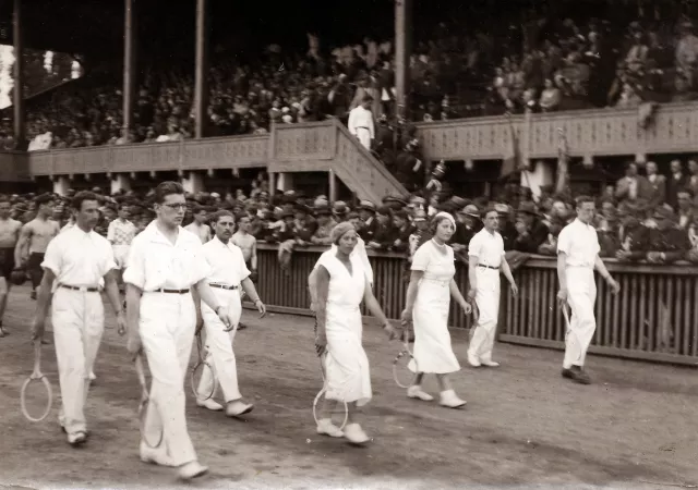 Ez egy felvonulás a Haggibor sportklubbal Kolozsváron. Az esemény a régi stadionban zajlott, amit később lebontottak, és betonból újraépítettek. A kép valamikor tavasz és ősz között készülhetett. Ez egy nagy esemény volt a városban, a lelátó tele volt emberekkel. Lehet hogy II. Károly király születésnapi ünneplése volt, május 10-én. [Neufeld György egészen véletlenül került a képre. A tenisz tagozat egyik tagja éppen hiányzott, és őt kérték meg, hogy a felvonuláson helyettesítse, habár ő a vívókhoz járt.]