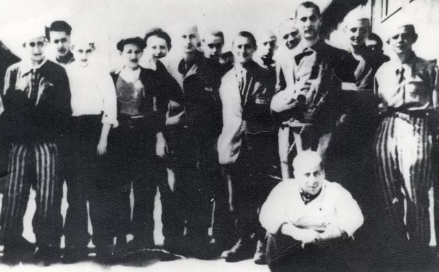 Egészen véletlenül jutottam hozzá ehhez a képhez, sok évtized után. 1945-ben készült Buchenwaldban. Összegyűltünk a lágerben [a felszabaduláskor], és egy amerikai katona fényképezgetett. Többek között lefényképezett minket is. Több évtized után pedig valaki látogatóba ment az Egyesült Államokba, és meglátta ezt a képet. Valakit felismert, s kérte, hogy sokszorosíthassa a képet. Akit ő felismert, az ismerte a többieket, és énhozzám is így került. Én jobboldalon a legszélső vagyok. Mondták aztán nekem: “Jellemző, hogy nyakkendőt teszel még a csíkos ruhádhoz is.”