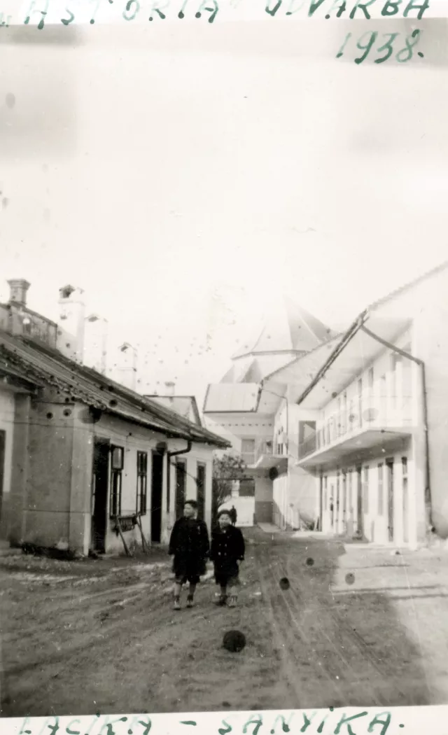 Az apai nagyapám, Nussbaum Heinrich házának a bejárata látható a képen, az udvarról nézve. Látszik is, hogy elég hosszú a ház udvara. Én 9 éves lehettem a képen, és az első elemista öcsémmel ketten az udvaron vagyunk. A háttérben látható torony a katolikus templom tornya. A ház homlokzata a főtérre nézett, előtte a tordai katolikus templom volt.