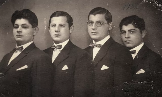 “A mi kedves drága szüleinknek, az önök fiai” -- ez van a kép hátára írva. Születési sorrendben vannak a képen, balról jobbra: Laci, Jenő -- az én apám, József, Sándor. A fiúk mind a négyen Budapesten születtek, de az apát áthelyezték Znaimba [Dél-morvaországi város, ma: Znojmo. -- A szerk.]. Az összes iskolájukat német nyelven végezték. A levelezésüket is németül bonyolították. Apjuk újranősült sok év után. Elvett egy bécsi nőt. A gyerekek németül beszéltek, tehát ha az apjuknak írtak valamit, németül írták, hogy megértse a mostohaanyjuk is. A többes szám (“szüleinknek”) azért volt, mert a nőt úgy fogadták el, mint anyjukat. Éppen a serdülő korban kaptak egy anyát. Jól beszéltek németül, a nő németül tudott, tehát ezt is [ami a fénykép hátára van írva] úgy írták.