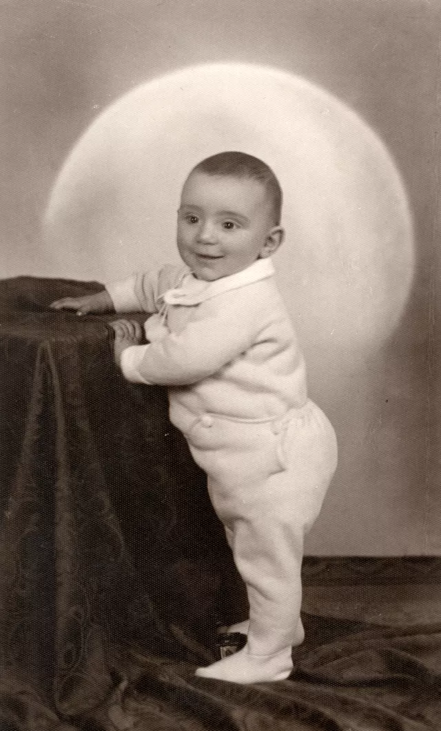 Ez az öcsém, V. L. Róla nincs is kisebb korából kép, igaz, jó, hogy ez megvan. A Zács Fotó Szalonban csináltattuk. Az a Király utcában volt valamelyik nagy kapu alatt, a színháztól kicsit kijjebb. Emlékszem, mentünk vele oltásra, és előtte elvittük lefényképeztetni. Még alig tudott állni, édesanyám ott állt, nehogy elessen, még olyan kis ingatag volt, olyan hat hónapos lehetett. A ruhája világoskék volt fehér gallérral és mandzsettával, méghozzá olyasmi anyagból, mint régen a melegítők: belül bolyhos volt, kívül meg kötött. Jó meleg volt.