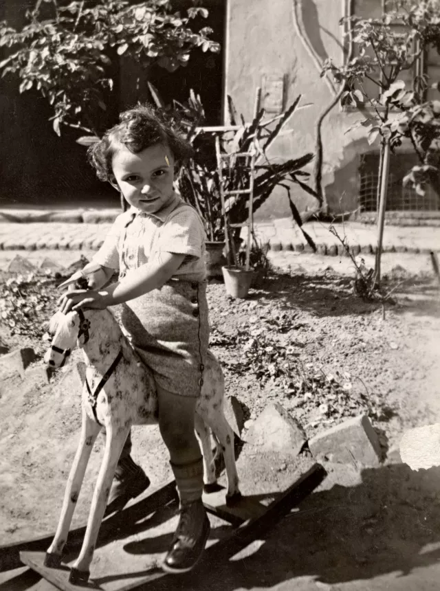 Ez a kép az udvarunkon készült, a Munkácsy utcában. Ez egy nagy U alakú épület volt. Ahogy bementünk, jobb oldalon, bal oldalon és hátul voltak a lakások. Falépcsőn lehetett fölmenni az emeletre. A fölöttünk lévő lakáshoz volt egy fa terasz, ahova ki lehetett állni, és zöld futónövény volt rajta. Az emeleten is két lakás volt. Ez egy nagy boltív a háttérben, csak nem látszik a teteje. Ezzel szemben volt a kapu. Nem volt utcai lakás. Az utcáról, ahogy szemben álltunk a kapuval, jobb kéz felől egy cipészműhely, bal kéz felől pedig fűszerbolt volt. Ahogy bemegyünk, jobb kéz felől volt egy kis folyosó, ott lakott a cipész a feleségével meg a lányával, aki két évvel fiatalabb lehetett, mint én. Vele együtt játszottunk. A fűszeresék zsidók voltak, Blauhorn volt a nevük. Két lányuk volt, az egyiknek szintén varrodája volt. Nagyon jó nevű volt. Szegény lány, púpos volt, kár volt érte. És volt egy testvére, egy nagyon szép teremtés, én nem is tudom, hogyan, de az itthon maradt.
