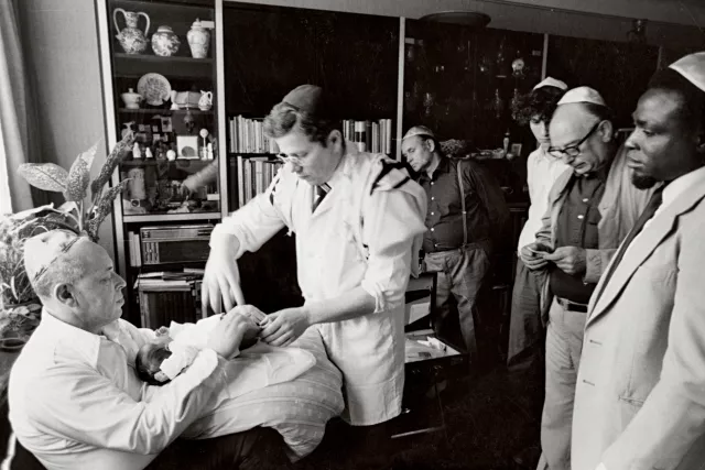A kép 1984-ben készült a mi lakásunkon, a kisebbik unokám brisze [lásd: körülmetélés] alkalmából. A ülő alak Dezső bátyám, ő volt a kvóter [Mondják "kvatternek" vagy "komának" is. Ő tartja az újszülöttet a körülmetélésnél. A koma feladatot vállal a gyermek további sorsának irányításában, segítésében. -- A szerk.]. A metsző nevét nem tudom, az ő háta mögött Rózsi nővérem harmadik férje kandikál ki. A kép jobbszélén a vőm, Olawuy Sámuel. Mellette Sas Andor, Rózsi nővérem násza. (Az ő fia vette feleségül a nővérem lányát.)