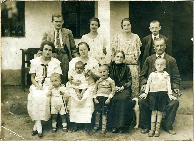 Ez egy nagycsaládi kép, amelyen az anyai nagyszüleim és a család látható. Látszik, hogy ez profi fénykép. Ha ez egy tornácos ház, akkor Debrecenben, Pirka lakása előtt készült. A kép jobb oldalán ül a[z anyai] nagyapám, Ornstein Mór és nagyanyám, Grósz Hermina. Mellettük közvetlenül az édesanyám, Ornstein Margit, mellette a bal szélen végül a nagybátyámnak, Laci bácsinak, Ornstein [Orbán] Lászlónak a felesége, Csibi néni, tehát ő nem közvetlen rokon. Az ülő sorban vannak a gyerekek. Nagyapám előtt Lajkó bátyám, azaz Kádár Lajos, nagyanyám előtt Sanyi bátyám, azaz Kádár Sándor, anyám ölében én, és itt áll Laci bácsi fia, akit Andornak hívtak. Az álló sorban jobbról az Ornstein nagynénik és nagybácsik: Lajos bácsi, ez a legidősebb fiúgyerek, Pirka néni, anyám húga, Böske, szintén húga anyámnak, és Laci bácsi, ő meg az öccse volt anyámnak. Egyet lehet ezzel a képpel kapcsolatban megjegyezni. A két öreg, a nagyszülők, azok még időben meghaltak, természetes halállal. Böske, a férje és a gyereke német koncentrációs táborban pusztult el. A többiek túlélték. Német internálótáborban [= koncentrációs táborban] volt Lajos bácsi és Pirka. Laci bácsi és Csibi néni és az ő fiuk, Andor Budapesten, a gettóban vészelték át az időket, közülünk, a három fiú közül, Lajkó Ukrajnában munkaszolgálatosként halt meg, én túléltem, de német koncentrációs lágerban, nagyrészt munkalágerban. Sanyi munkaszolgálatos volt, de túlélte, mert Vállajon vagy Csanáloson át vitték őket nyugatra, és ő ott megszökött.