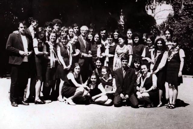 Tanárként állok egy végzős osztállyal a Spiru Haret Gimnáziumban, Bukarestben, az 1970-es években. Középen állok, én vagyok az ősz hajú férfi, aki szemüveget visel.