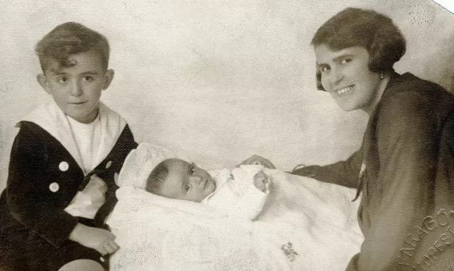 Ez a kép Rákospalotán készült 1926-ban, anyám szüleinél. Én balra ülök, anyám jobbra, és közöttünk az öcsém, Dodika, aki akkor hat hónapos volt. Tébécét kapott a szoptatós dajkától, és Újvidéken senki sem tudta meggyógyítani, ezért Budapestre mentünk. Az ottani orvosoknak sikerült meggyógyítaniuk, és életben maradt.