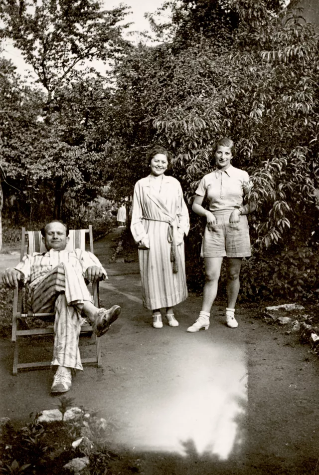 Ez a kép a Római parton készült, valamikor az 1930-as években. Középen én vagyok, mellettem Steiner Zsuzsi barátnőm. Az ülő férfi, Zsuzsi férje. A Római parton volt egy-kis nyaralójuk, ott látogattam meg őket. Akkor divat az ilyen csíkos pizsama és a csíkos köntös, ami rajtam van. Zsuzsiékat nem deportálták, de nem tudom mi lett velük. A háború után teljesen megszakadt a kapcsolatom velük.