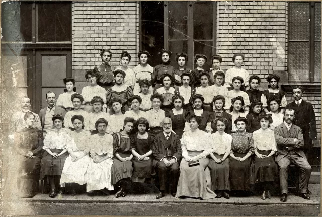 A kép édesanyámat [Ziegler Aranka] ábrázolja. A legfelső sor jobb szélén áll. Tizennégy éves lehet. Abban a polgári iskolában készült a kép, ahová járt, a Dohány utcában.