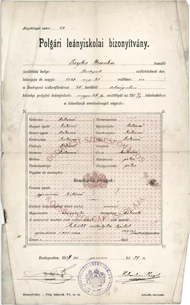 Anyám polgári leányiskolai bizonyítványa 1907-ből. A hetedik kerületi, Dohány utcai polgári leányiskola bocsátotta ki.