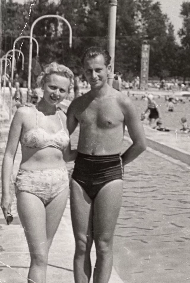 A kép leány koromban, 1949-ben készült a Palatinus strandon a jövendő férjemmel.