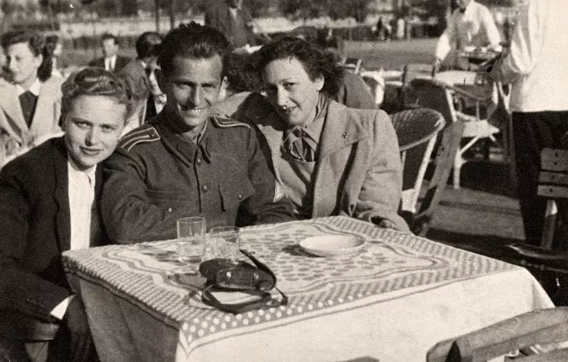 A kép 1949-ben készült a Margit-szigeten, amikor a férjem még udvarolt nekem. Balról jobbra: én, a férjem és egy kolléganője. Azért van egyenruhában, mert behívták valami tartalékos tiszti iskolára, pár hónapra. Hadnagyként szerelt le, de aztán többet soha nem volt katona.