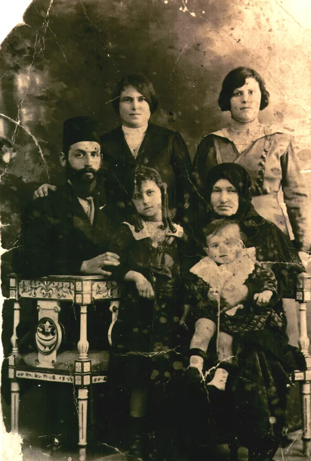 A kép az 1910-es évek közepén készülhetett, Alexandriában Ez az egyetlen kép, amin rajta van az anyai nagymamám, Ráhel Zip, akivel én sosem találkoztam. Ő az ülő, idős néni kendőben. Nagyon-nagyon vallásos asszony volt, ahogy hallottam anyukától. Az ölében tartja egyik unokáját, talán Joszefet, aki Szárá nagynéném [bal oldali álló alak] és a férje, Goldenberg Móric [bal oldali ülő alak] egyik fia volt. A többieket nem tudom, kicsodák, a nagymama mellett álló, fiatalabb kislány talán Cipóra lehet, aki a legidősebb gyereke volt a nagynénéméknek. A nagymamáék Palesztinában laktak már ekkor [Vagyis 1913 után készült a kép, amikor visszamentek Magyarországról Palesztinába. -- A szerk.], de úgy látszik, látogatóba ment a lányához, Alexandriába.