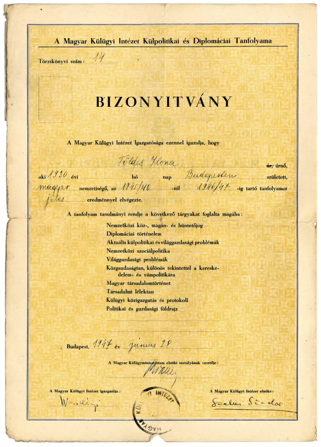 Rév Lajosé külügyi intézeti bizonytványa