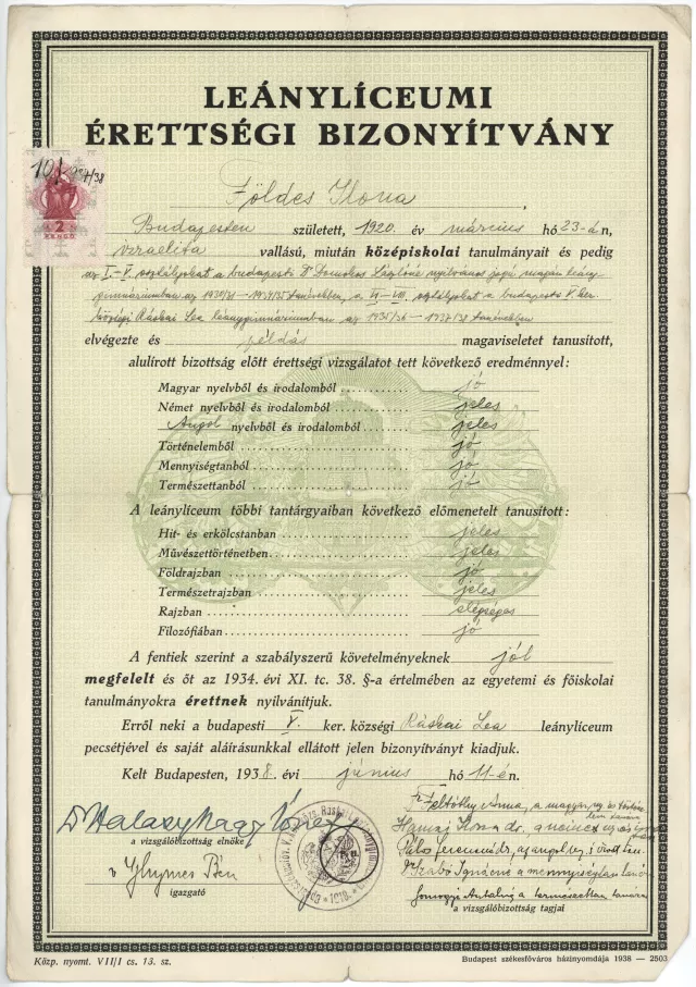 izraelita vallású, miután középiskolai tanulmányait és pedig az I-V. osztályokat a budapesti Dr. Domokos Lászlóné nyilvános jogú magán leánygimnáziumban az 1930/31-1934/35 tanévekben, a VI-VIII. osztályokat a budapesti V. ker. községi Ráskai Lea leánygimnáziumban az 1935/36-1937/38 tanévekben elvégezte és példás magaviseletet tanúsított,