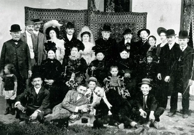 A képen az apai családom látható Gizella néni és Frankl úr esküvőjén. A felső sorban középen áll a menyasszony, jobbján [a képen tőle balra] a vőlegénnyel.