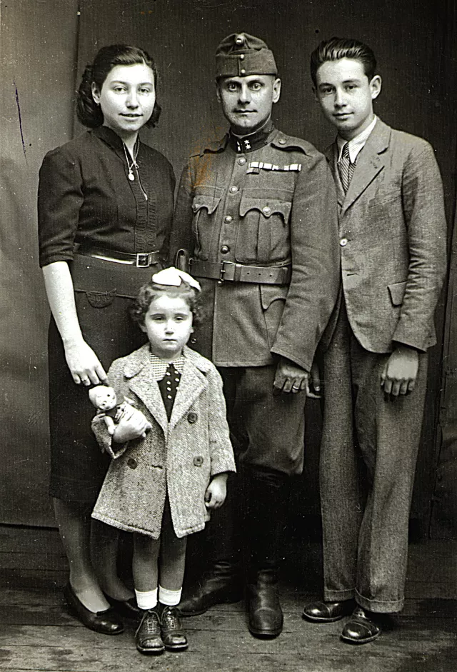 Ez Irén sógornőm férje, Rosner Márk. Ő a középső, a katona. Mellette (jobbra) a fia, Endre és a lánya, Ibi (balra). Elöl a kislány a Judit lányom. Ez a kép 1938-ban készülhetett Budapesten.