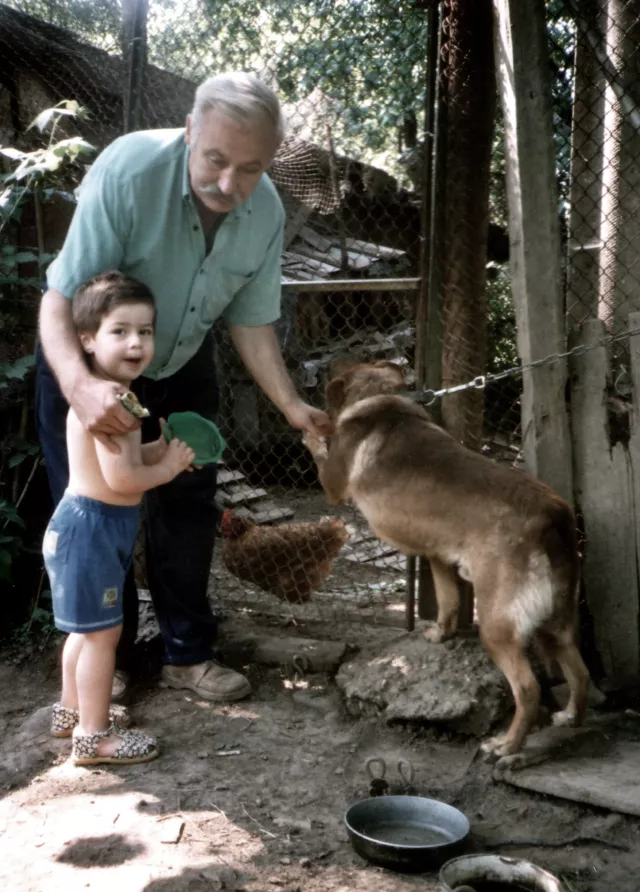 A képen István fiam van a dédunokámmal, az ő unokájával, Andrással. A kép a mi házunk udvarán készült Ungváron, 2001-ben.