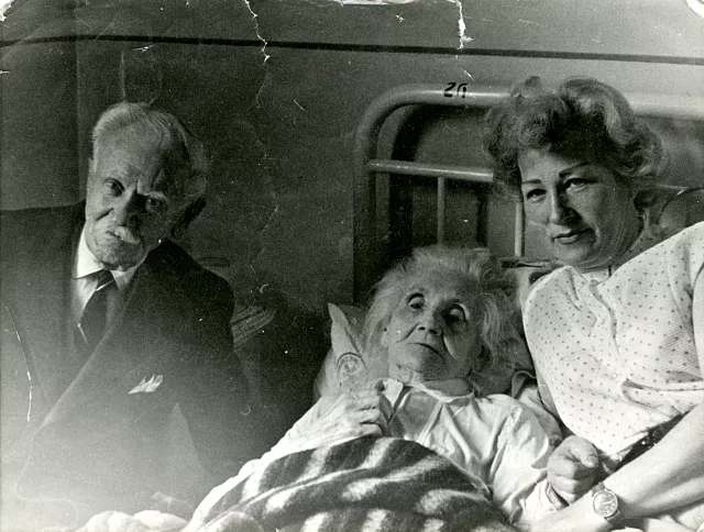 Édesanyám [B. S-né, született S. Gizella] halálos betegen a kórházban, 1965-ben. Balról a testvére, Gyula, jobbról én.