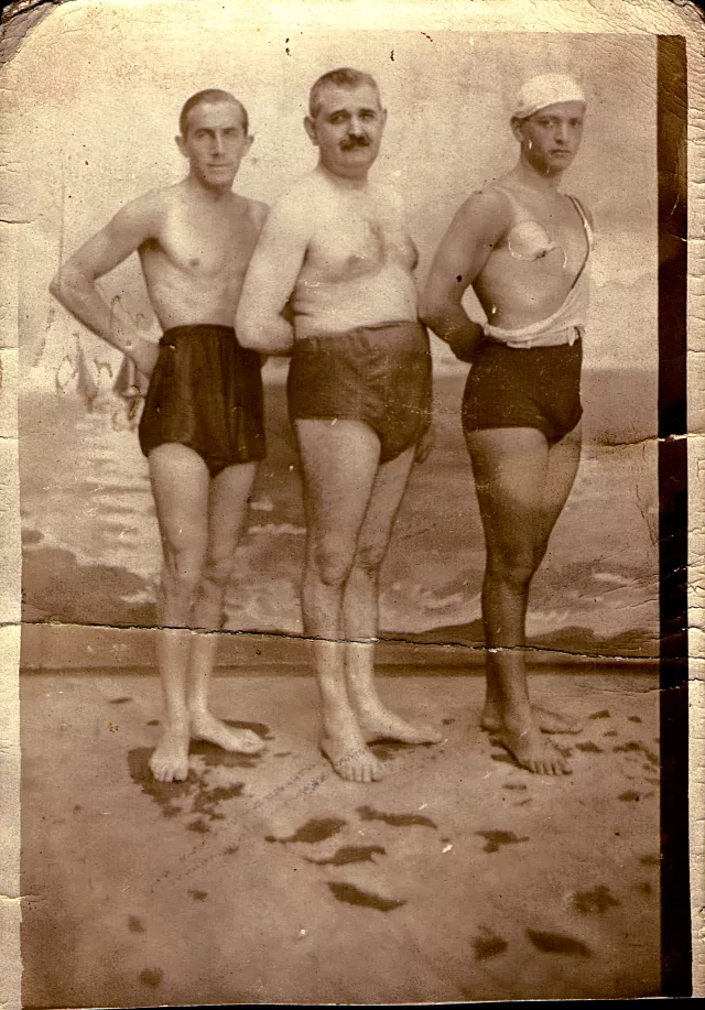 Ez a kép a Császár-fürdőben készült. [A Császár-fürdő Budapest egyik legrégibb fürdője. A fürdőt a 19. század közepén Hild József tervei alapján teljesen átépítették, és ekkor nyerte el mai formáját. Reprezentatív nagy gyógyudvara a korszak társasági életének egyik legelegánsabb színhelye volt, ahol estélyeket, bálokat, hangversenyeket rendeztek. 1860-ban férfi és női uszodával bővült ki az épület. A második világháború után állami kezelésbe került. 1976-ban versenyuszoda épült hozzá, amelyet Komjádi Béláról, a magyar vízilabdasport megalapítójáról neveztek el. -- A szerk.] Én vagyok a jobb oldali, apám áll középen, és baloldalt a Pali.