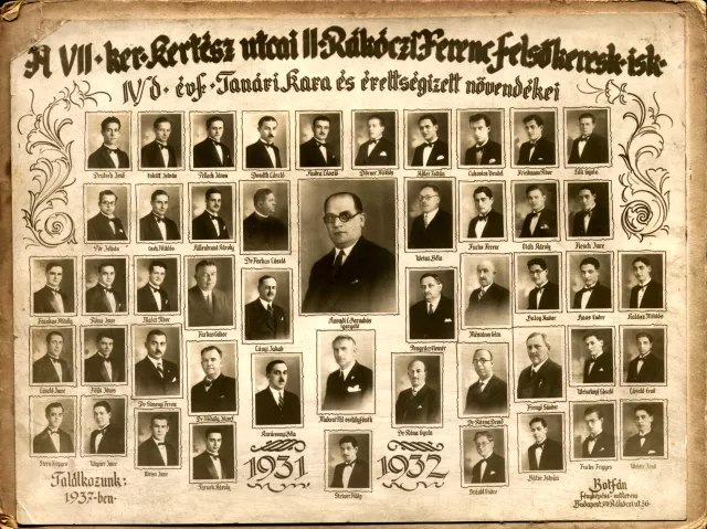 Ez az érettségi tablónk, 1932-ből, Budapestről. Én a két évszám között vagyok, középen. Azért kerültem ilyen elegáns helyre, mert én voltam az önképzőkör elnöke.
