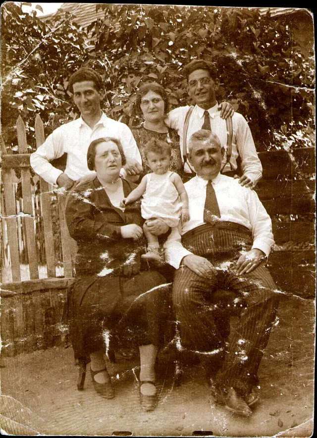A család Budakeszin, ahova nyaralni jártunk. Jobboldalt ül apukám, Steiner Zsigmond, mellette anyukám, és a nővérem lányát, Marit tartják a kezükben. Hátul középen áll a nővérem, Joli, jobbra én, Jolitól balra pedig a férje, Klein Sándor.