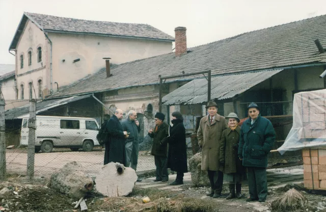 A kép Marosvásárhelyen készült 1999. március 9-én. Egy svájci német küldöttség volt itt, baloldalt állnak a képen. Ezek segítettek bennünket, mikor a marosvásárhelyi zsinagógát javítottuk. (Három évig tartottak a munkálatok, 2000-ben volt a felszentelés.) Adtak 30 000 svájci frankot, akkor ez nagy összeg volt. Nagyon összebarátkoztunk velük. Egy alkalommal, amikor itt voltak, akkor érdeklődtek, hogy létezik-e még a volt gettó. És akkor kivittük őket a koronkai téglagyárhoz.