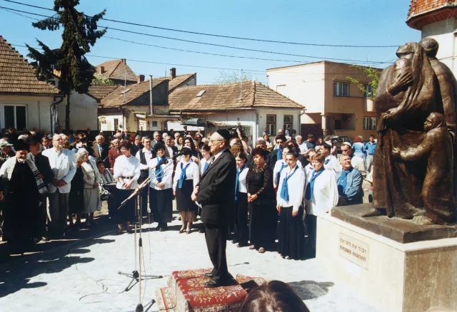 Külföldi segítséggel, a városnak a hozzájárulásával és a Kultuszminisztérium lényeges hozzájárulásával sikerült a szobrot bronzba önteni és felállítani. A szobornak a felavatása alkalmából készült a kép. A felavatáson részt vettek marosvásárhelyi lakosok, külföldiek Izraelből, Skóciából. Itt volt a romániai zsidó hitközségnek a vezetősége a főrabbival, Menachem Hacohennel. Itt volt a temesvári főrabbi, Neumann Ernő vagy Ernst, ahogy szokták hívni. Itt van a képen baloldalt. Mellette a bukaresti hitközség egyik delegátusa, utána pedig Spielmann Mihály áll, a Teleki Téka könyvtár főkönyvtárosa. Itt volt Skócia főrabbija, Weis rabbi, ő vallásos, ortodox rabbi. Direkt eljöttek Glasgow-ból, körülbelül húszan, hogy részt vegyenek a felavatási ünnepségen. A hátsó csoport az a kolozsvári kórus, az alkalomhoz méltó héber és jiddis dalokat énekeltek.