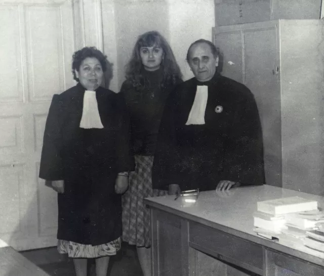 Ez a kép Marosvásárhelyen, az én irodámban készült 1980-ban. A feleségem Zikh Mária, a fogadott lányom, Zsuzsa és én vagyok a képen. Mind a ketten a feleségemmel talárban vagyunk. A talár fekete volt, az enyémen van egy aranyozott jelvény kék beírással. Be volt írva: ‘Lex’ (Törvény). A tisztviselőknek nem volt ilyen jelvényük, csak a bírói karnak és az ügyészeknek. Ott volt az én íróasztalom, ami látszik is a képen. A feleségem jegyzőnő volt a törvényszéken. Zsuzsi, azt hiszem, iskolából jött. Itt, azt hiszem, 16 éves volt, és a művészeti iskolába járt. Éppen bejött egy fényképezőgéppel az egyik kollégánk, aki a kriminalisztikának volt a vezetője, és azt mondta: “Na, álljatok egymás mellé!” Sajnos, fiatalon meghalt. Ő szokott fényképezni. Például a kriminalisztikai intézetnek, ami az ügyészség keretein belül működött, volt filmező gépje, és videónk is már volt 1970 végén. Filmek akkor még nem léteztek, s csak azzal szórakoztunk, hogy ő a gyűléseken filmezett, és aztán összeültünk, megnéztük, és jókat kacagtunk. Nagyon élveztük.