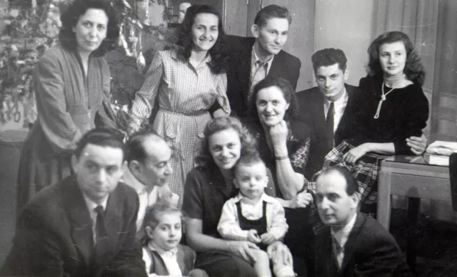 A Köteles Sámuel utcai lakásunkban készült a kép 1955 után, karácsonykor. Volt négy szoba, s a négy szobában négy család lakott. A második sorban balról az első én vagyok (aki áll). Mellettem az unokaöcsém felesége, Deutsch Éva és az ura, Deutsch Gyula. A második sorban jobbról a második, az a jóképű fiú, végre megkapta az egyik szobát, és megnősült. Egy román kislányt vett el, Lianát (jobbról az első), aki úgy beszélt magyarul, mint mi. A fiúnak egy magyar szappangyáros volt az apja, Brechnernek hívták, azt hiszem, német származású lehetett. Az első sorban az első baloldalt csak egy látogató, mellette az első uram. Az ölében egy barátnőmnek a kislánya van. A gyerek biztosan ebédre volt nálunk. Mellettük az András felesége, Júlia Pocok "úrral", a gyerekével az ölében, s aztán András, az öcsém. 1960 tavaszán Andrásék elmentek Olaszországba. A nő, aki az állát támasztja, Júlia anyja.