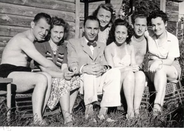 A Maros-gátnál volt egy nagyon szép kicsi házunk, és ott készült a kép. Ez egy kisebb társaság volt. Én jobbról a harmadik vagyok. Jobbra az első a legjobb barátnőm volt, Weinberger Ducinak hívták, egy Gyergyóból bejött lány. Az apja számfejtő volt a városházán. Andris ül mellettem jobbra. Mögöttem volt egy Citrom Éva nevű zsidó lány, aki később nagyon aljasnak bizonyult. A háború előtti pár évben feljárt a kozmetikába, s nézte, hogy csinálom. Egy nap azzal jött, hogy tanítsam meg. Auschwitzban aztán nagyon csúnyán viselkedett. A picusnyakkendős egy ismerős. Baloldalt a fiúra meg a lányra nem emlékszem. Mindig annyian jöttek-mentek. Valaki közülünk fényképezett.