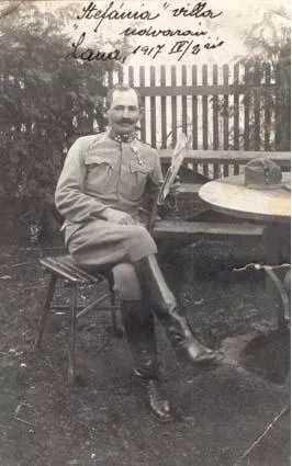 Schillinger Ervin, Schillinger Emánuel nagyapa testvére küldte ezt a fényképet 1917-ben Lanából, a Stefánia villából. A fénykép hátára az van írva, hogy a hadseregből küldték ('von der Armee im Felde'). A nagyszüleim, Julianna és Schillinger Emánuel pészahi üdvözletként kapták.
