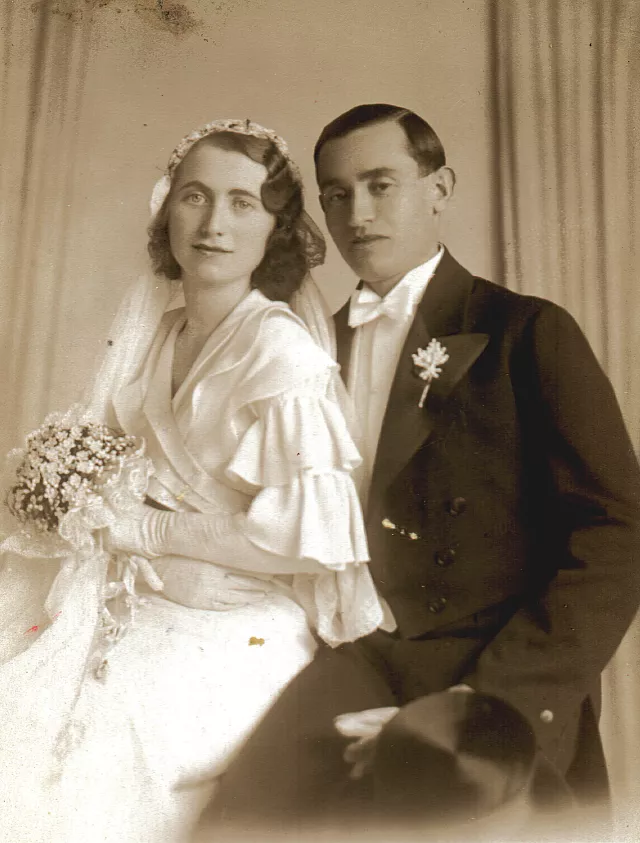 Ez Etel meg a férje, körülbelül 1934-ben vagy 1935-ben, ez az esküvői képük. Szerintem a Bethlen téri templomban volt az esküvőjük. De nem emlékszem rá. Lehet, hogy nem is voltam ott. A Judittal voltam talán már terhes, de nem biztos.