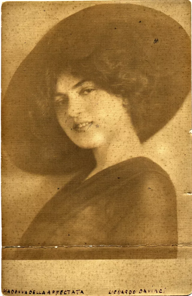 Anyám, 1910. Egy Leonardo kép mintájára pózolt itt be. Tréfából írta oda franciául [olaszul: Madonna della Affectata]. Francia volt a család egy részének az érintkezési nyelve, mert volt két nagynénim, rendkívül előkelő hölgyek. Az én két nagynénémet (Dinora és Henriette) olyannyira franciául tanították, hogy később képtelenek voltak megtanulni magyarul.