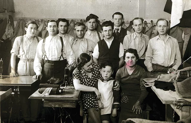 Ezen a képen sok idegen van. Hogy mikor készült, nem tudom -- valamikor 1938 és 1942 között. Ez az apukám szabóműhelyében van az Almássy téri lakásban. Jobbra áll apukám, balra a második a testvérem, Etel férje, Schneller József, aki társa volt apukámnak. Elöl, pöttyös ruhában Spitzer Janka van, aki apukám nővérének, a Milka néninek a lánya. Ő Izraelbe ment ki, de hogy mi van vele, nem tudom. Ez a kisfiú a Janka nővérének a kisfia. Úgy tudom, az is Izraelbe ment ki, de nem tudok róla többet. Jobbra elöl, a kisfiú mellett, az a mostohaanyám testvérének a lánya. Őróla sem tudok semmit, csak hogy ott dolgozott a műhelyben. Ezek mind ott dolgoztak a műhelyben, apuka mellett. Jobbról az ötödik hátul -- nem tudom a nevét -- az egy nagyon rendes tag volt, nagyon sokat segített a zsidóknak, és nekünk, a családnak is. Ő volt az, aki megpróbálta kimenteni a kisvárdai gettóból a szülőanyám testvérének, a Miska bácsinak a kisfiát. Csepelen lakott. A többiek segédek voltak.