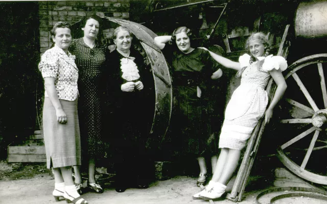 Ez a kép a nagykőrösi házban, az udvarban a raktár előtt készült. Ez számomra nagyon kedves kép, mert mindazok a szeretteim így élnek az emlékezetemben. 1941-ben ment tönkre édesapám cége, akkor még ott ez valami nagy gép volt, mezőgazdasági gép lehetett. A bal szélén Rosenfeld Gyuláné, Ilonka néni, a nagynéném. Utána következett egy unokatestvér, aki Olaszországban élt, akinek a férjét autóbaleset érte. És aztán fehér zsabóval a nagymamám, Sebestyén Manóné, mosolygósan, kedvesen, ez volt a legjellemzőbb rá, ahogy emlékszem. Az anyukám rákönyököl a gép hajtószíjára. Én pedig a vállára teszem a kezemet. Itt is dirndlis ruha van rajtam [A dirndlis ruha puffos ujjú, bő szoknyájú nyári ruha, amelyhez kis kötényt viseltek. -- A szerk.].