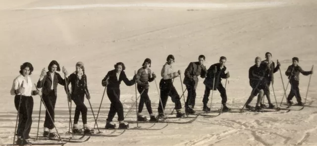 Nyáron a gyerekek nyaraltak Baldócon, télen pedig síelni jártunk oda. Balról jobbra: ismeretlen, Reich Márta barátnőm, én, Gönczi Flóra, mellette Judit nővérem. A többit nem tudom.